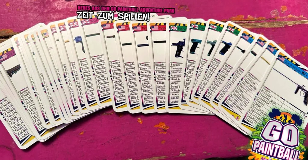 wir freuen uns, euch unser brandneues Produkt vorstellen zu dürfen: Das Go Paintball Adventure Park Quartett! Mit diesen 32 Karten habt ihr die Möglichkeit, alle Paintball-Markierer der bekanntesten Hersteller zu sammeln und euer Wissen über diese spannende Sportart zu erweitern.