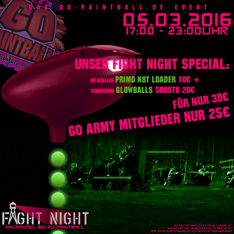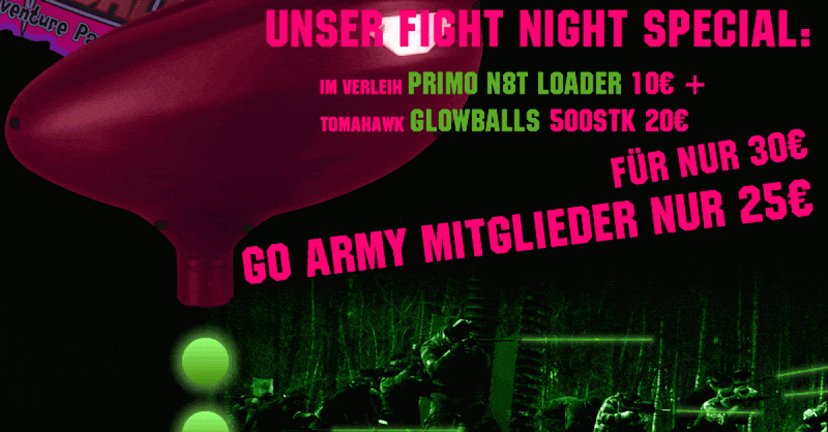 Für alle Fight Night Spieler haben wir ein Verleih-Paket zusammengestellt: Primo N8T Loader plus 500 Tomahawk Glowballs für 30€ (10€ Loader / 20€ Nightballs).