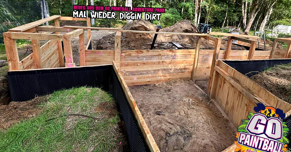 Hallo liebe Gäste,die Arbeiten am Diggin Dirt Grabenfeld gehen weiter. Die Holzgrabenstützen sind nun fertig verbaut. Jetzt wurde die Folien eingezogen, um das Holz zu