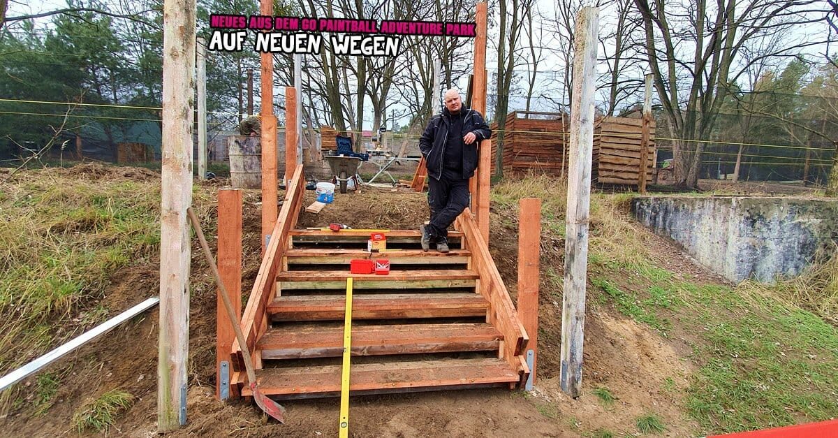 die neue Treppe zu den Spielfeldern ist im Bau und nun auch fast fertig. Stolz steht Patrick auf den neuen Stufen. Über diesen Weg gelangt ihr in Zukunft zu Spielfeldern wie Sup’Wood und The Fortress. Wir haben versucht, die Wege zu den Spielfeldern deutlich zu vereinfachen. Jetzt habt ihr kürzere und einfachere Wege zum Paintball-Spaß.