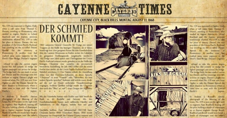 Cayenne Times 22. August 1868. Maik’s Blacksmith kommt nach Cayenne! Endlich ist auch Maik mit seinem Schmiedehandwerk in Cayenne eingetroffen. Sein Geschäftsschild an seiner neuen Schmiede