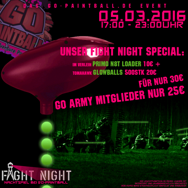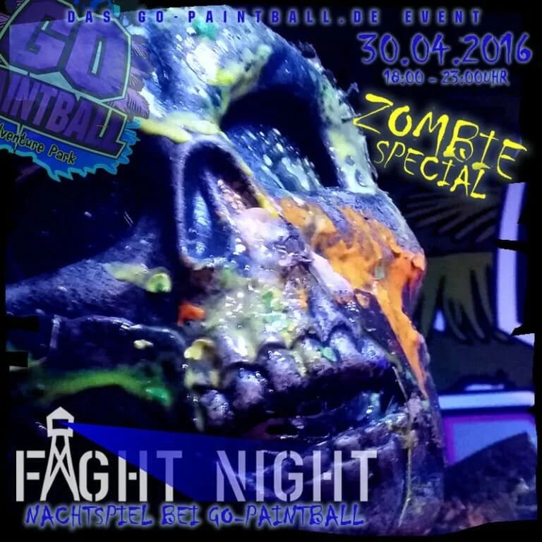 Datum: Samstag 28.05.2016 ab 19Uhr bis 23Uhr. Zur Veranstaltung: Fight Night #4 ist angesagt! Am 28.05.2016 öffnet der Go Paintball Adventure Park seine Pforten für