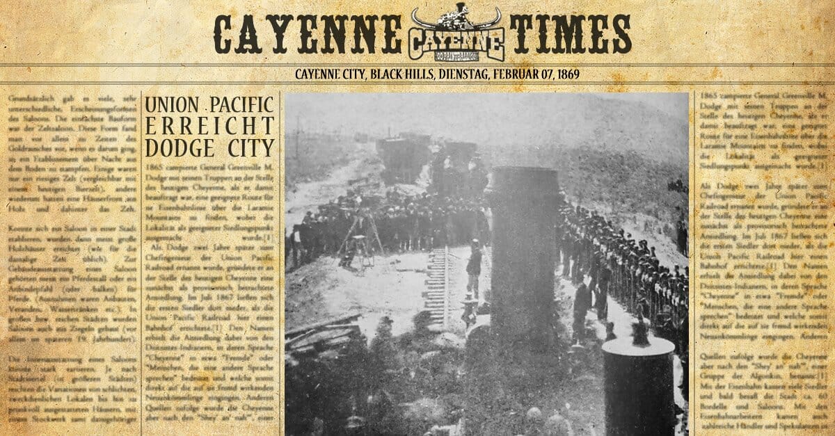 Der Bau der Eisenbahn nach Cayenne geht weiter. Heute hat die Union Pacific die kleine Stadt Dodge City erreicht. Die Bürger von Dodge City feiern und freuen sich über das Eintreffen des ersten Zuges, der wichtige Waren an die Stadt liefert. Nun ist die Eisenbahn auch nicht mehr weit von Cayenne entfernt. Laut Aussage der Eisenbahngesellschaft kann aber noch kein Datum genannt werden. Zu viele Herausforderungen liegen noch in den letzten 39 Meilen auf dem Weg. Die Streckenbauer sind daher sehr vorsichtig geworden konkrete Zeitpläne zu nennen. Ursprünglich war die Fertigstellung für Juli letzten Jahres geplant und musste dann aus verschiedenen Gründen verschoben werden.
