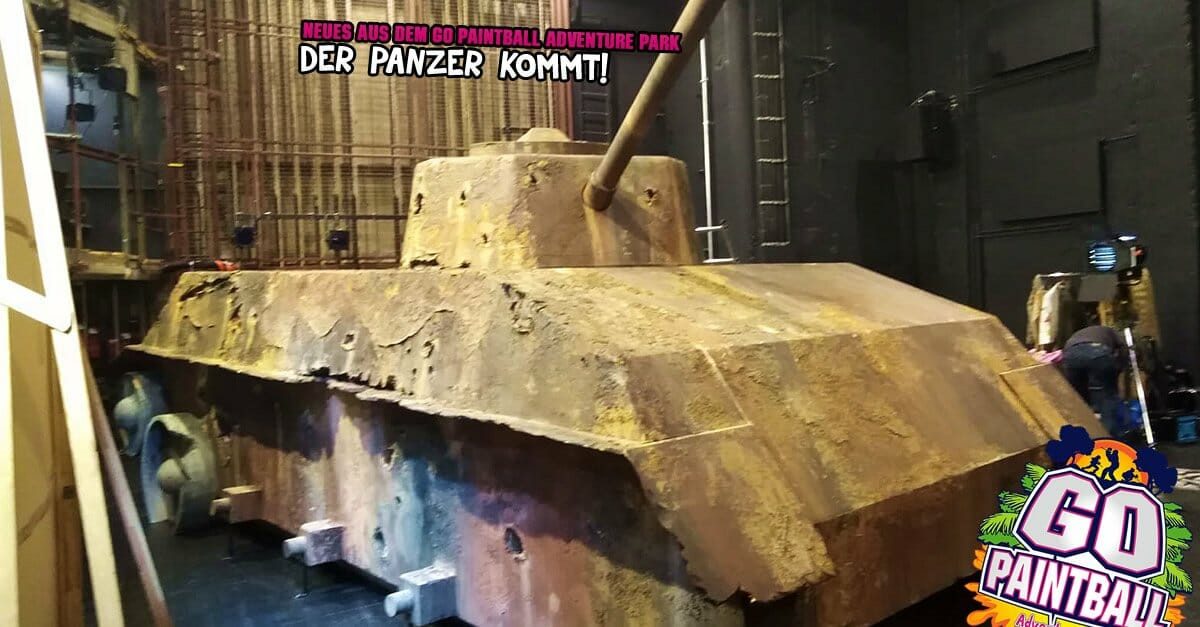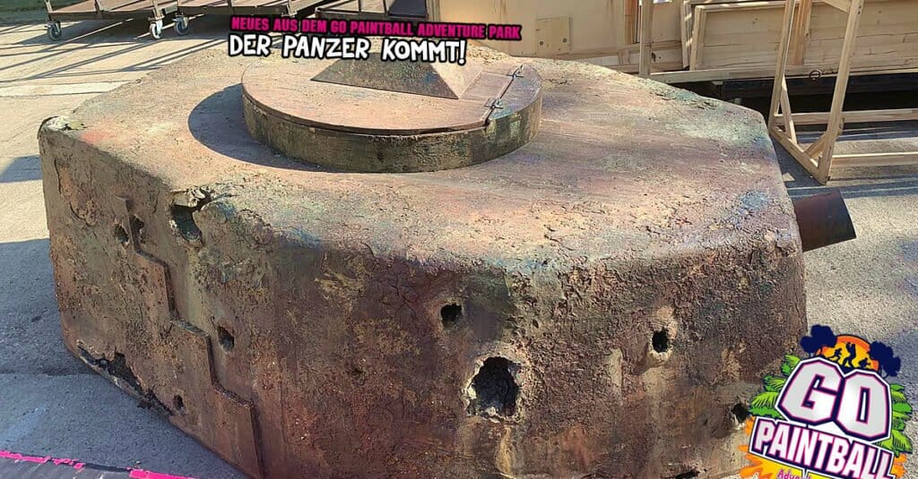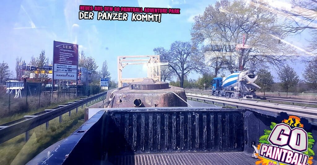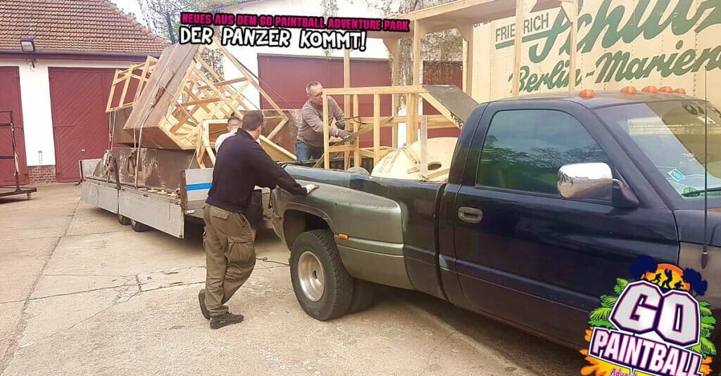 der Panzer kommt direkt aus der Theater-Werkstatt, wird zerlegt, verladen und findet sein Zuhause bei uns im Park. Der Panzer ist einfach zu schön geworden, um ihn einfach nur auf einem Spielfeld zerschießen zulassen und daher werden wir ihn in der Players-Area für euch aufstellen. Es sieht zwar auf den ersten Blick nicht danach aus, aber das dicke Ding ist aus Holz und künstlich auf alt modelliert.