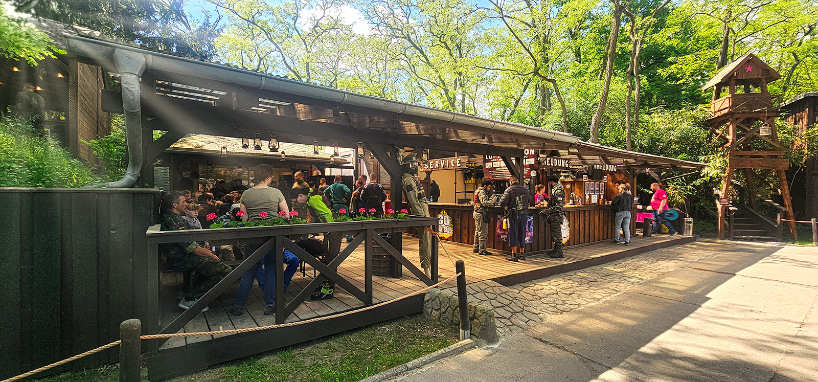 Mit gemütlichen Tischen und Sitzmöglichkeiten laden wir dich ein, dich zurückzulehnen, das tropische Ambiente zu genießen und das aufregende Paintball-Geschehen bequem zu beobachten. Jede Ecke der Lounge wurde mit größter Sorgfalt gestaltet, um dir ein rundum angenehmes Erlebnis zu bieten.