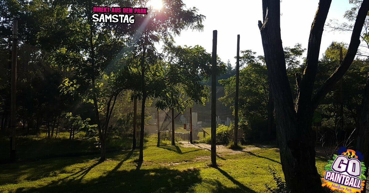 die sprichwörtliche Ruhe vor dem Sturm… Der Park liegt friedlich in der Morgensonne und wartet auf einen heißen Paintball-Tag.