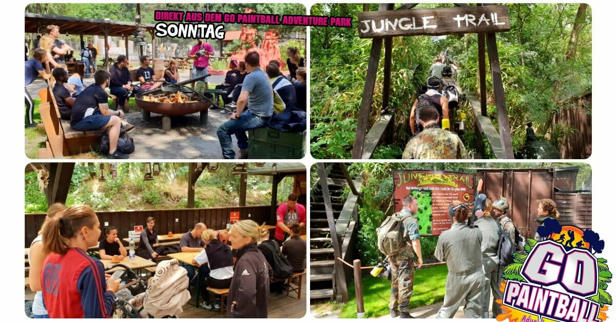 auch heute ist wieder ordentlich was los im Park und das Wetter ist heute nicht ganz so heiß. Wir haben jetzt schon für euch ein paar Bilder vom Ort des Geschehens. Auf Bild 1 seht ihr die Einweisung in gemütlicher und entspannter Runde, Bild 2 zeigt unsere Gäste beim Ausfüllen der Erklärung im GO IMBISS, Bild 3 Unsere Gäste planen ihr erstes Spiel und nehmen dazu die Spielfeldkarte zur Hilfe und auf Bild 4 geht es los ins Spiel. Nur noch die Treffe rauf in den Dschungel Pfad und der Spaß kann beginnen.