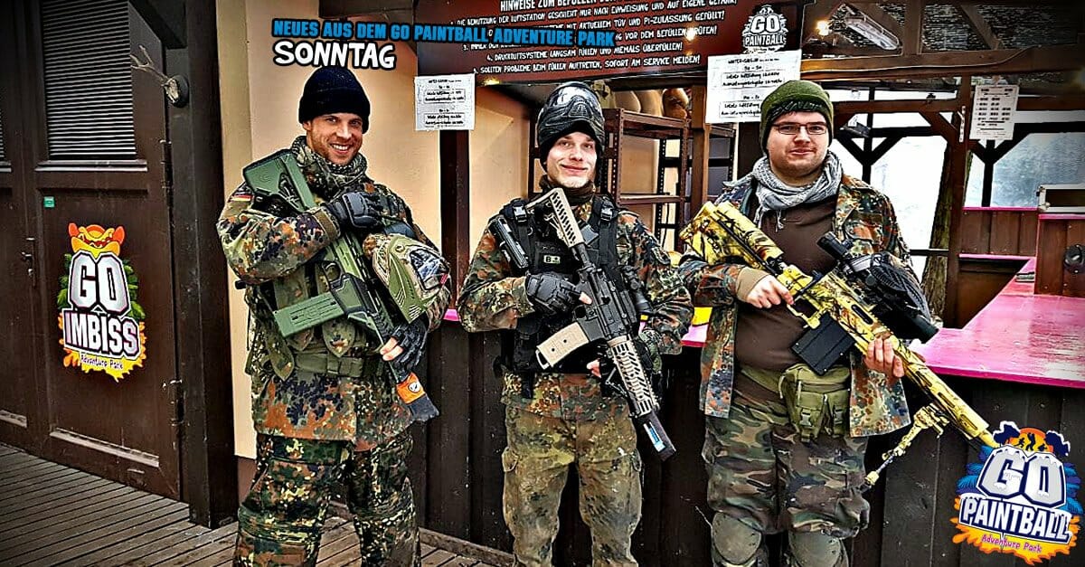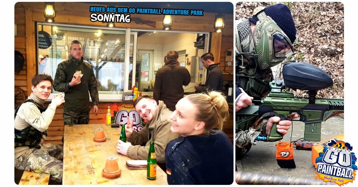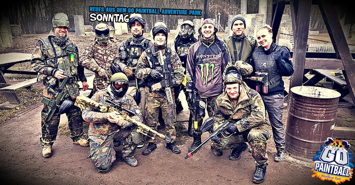 live, direkt und in Farbe aus dem GO PAINTBALL ADVENTURE PARK. Heute mit zwei Gruppenbildern unserer Weekend Warriors. Paintball, dann lecker GO BURGER essen und Fritz Cola trinken, dann Paintball. Dazu ein Runde am Feuer wärmen und weiter in die nächste Farbschlacht. Klingt nach einem guten Plan unserer Gäste am Sonntag.