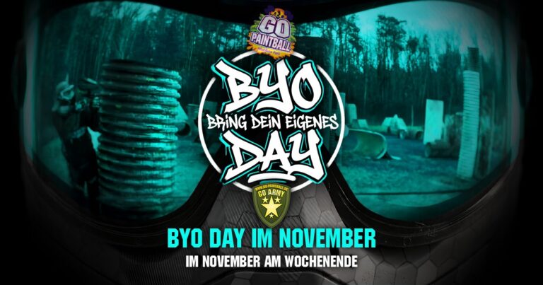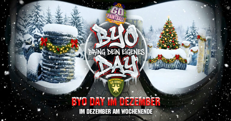 jedes Wochenende BYO, außer 26./27.12. Im Dezember 2026 ist an fast jedem Wochenende BYO DAY im GO Paintball Adventure Park Berlin: eigene Ausrüstung mitbringen, 100