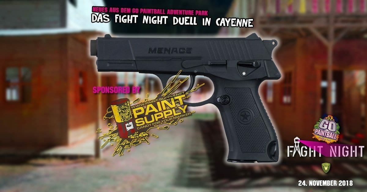 die Fight Night am 24.11.2018 rückt näher. Zum Ende der Fight Night, gegen 21 Uhr findet in der Western Stadt CAYENNE ein klassisches Pistolen Duell statt. Geschossen wird mit zwei GI MENACE Pistolen, die von dem Paintballshop PAINT SUPPLY gesponsort werden. Der Gewinner erhält eine brandneue GI MENACE (sponsort by Paint Supply) und ein halbes Jahr gratis Eintritt und gratis Luftpauschale im GO PAINTBALL ADVENTURE PARK. Eine heiße Nacht wartet also auf euch!