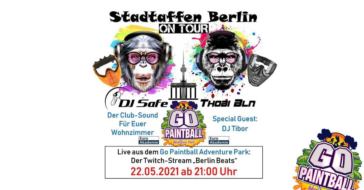 Die „Stadtaffen Berlin“ und „DJ Tibor“ erobern den GO Paintball Adventurpark und versorgen euch über Twitch mit heißen Clubsounds. Schaltet ein und dreht die Anlagen auf!!!
