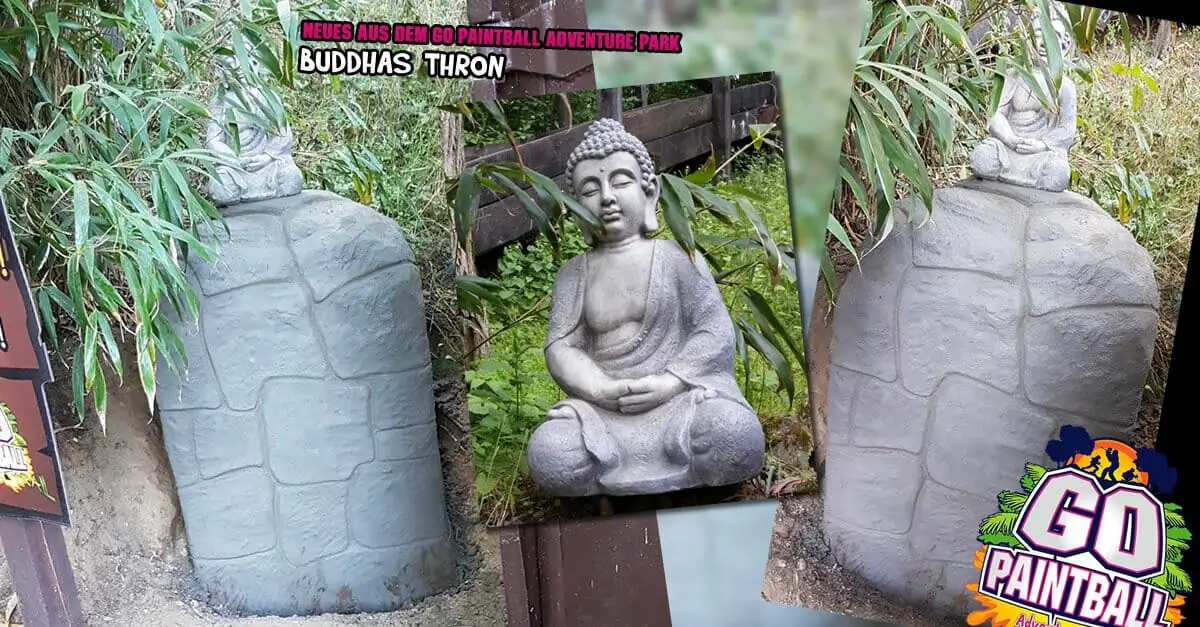 endlich hat unser Buddha einen Thron und sitzt nicht mehr nur auf dem alten schnöden Betonpfeiler. Mit etwas Zement und Putz haben wir hier eine schöne Verkleidung modelliert. Jetzt muss Buddhas Thron nur noch angemalt werden. Buddha sitzt neben dem Eingang zu unserem Jungle Trail und sorgt mit seinem Segen für verletzungsfreies Paintballs-Spielen. Danke Buddha!