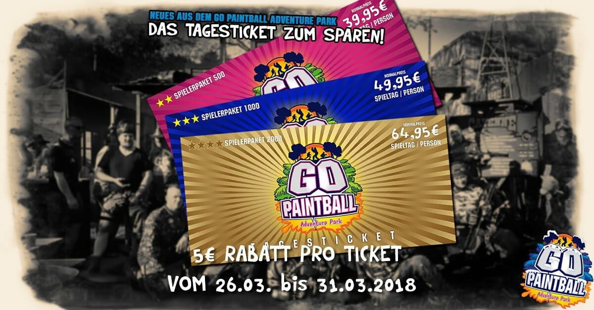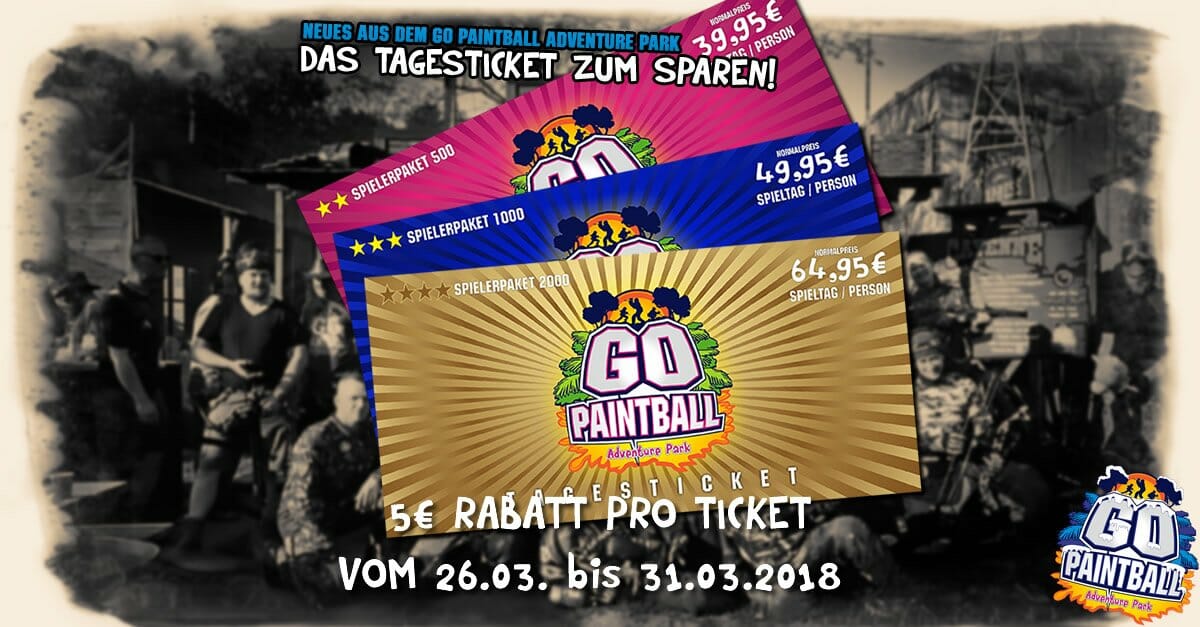 aufgepasst, jetzt könnt ihr wieder sparen! Das Tagesticket 500, 1000 und 2000 gibt es vom 26.03. bis 31.03.2018 vergünstigt! Geht dazu einfach auf unsere Webseite oder nutzt diesen Link: https://www.go-paintball.de/produkt-kategorie/spielerticket/