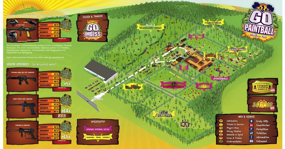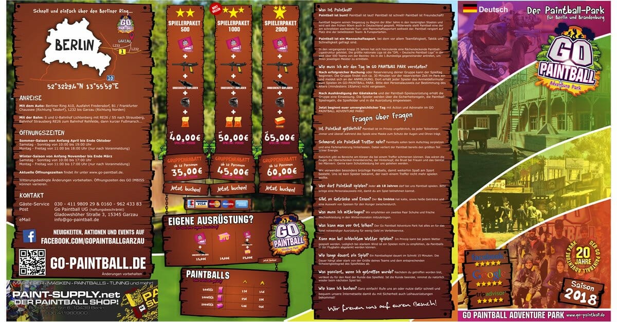 pünktlich zur Saison 2018 ist die neue Broschüre für den GO PAINTBALL ADVENTURE PARK fertig geworden. Es ist wieder ein hübsches Stück geworden, der man die viele Arbeit daran nicht ansieht. Ihr könnt euch die neue Broschüre unter dem folgenden Link anschauen. Wir haben euch eine kleine Version (unter 1MB) und eine große Version (ca. 15MB) zum Download bereitgestellt: https://www.go-paintball.de/spielfelder/