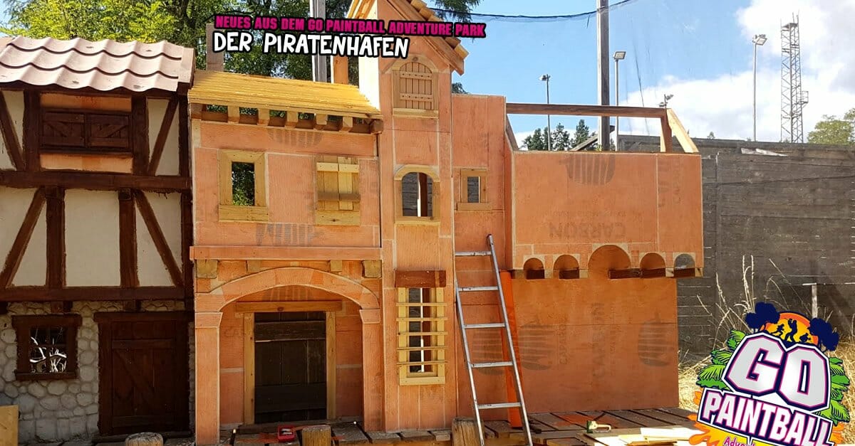 fleißig gehen die Arbeiten am Kinderspielplatz weiter. Weitere Häuser im Stil eines karibischen Piratenhafens sind errichtet und werden nun mühsam mit Matten beklebt, damit alles verputzt werden kann. Maik hält auf dem ersten Bild den kleinen Balkon, der dann nach dem verputzen montiert werden kann. Im Hafen wird später der Spielturm in Form eines Schiffs errichtet. Dazu brauchen die Kinder einen Kugelfang, der Paintballs von den umliegenden Spielfeldern abfangen soll. Sicherheit geht natürlich vor. Eine einfache Holzwand hätte anstelle natürlich auch gereicht, aber wir wären nicht GO PAINTBALL wenn es nicht wieder DIE Holzwand werden würde, oder?