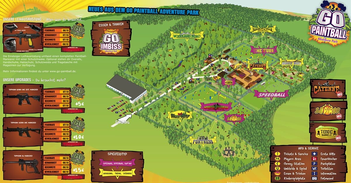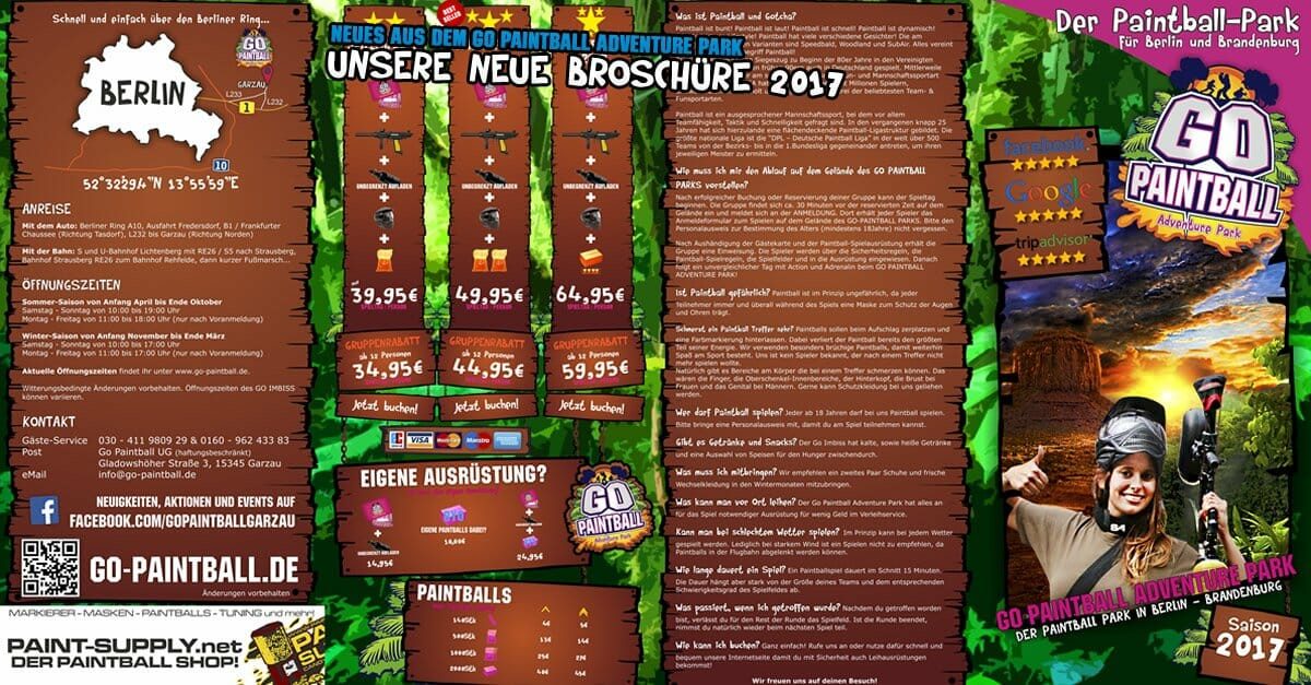 eifrig haben wir an der neuen Broschüre für die Saison 2017 gearbeitet. Alle unsere Neuerungen wurden dabei bereits eingearbeitet. Die neue Chronystation, die neue Luftstation, „The Rock“ wurden eingezeichnet, ebenfalls die kommenden Attraktionen Spielfeld Cayenne und der Kinderspielplatz. Der Kinderspielplatz wird nun endlich dieses Jahr für euch gebaut, nachdem alle Vorarbeiten erledigt sind. Ebenfalls wird auch wieder das Sup’Air Spielfeld in neuem Layout aufgestellt , sowie Toxic Barrelz erweitert und verbessert. Mehr Fässer und ein cooles Layout sind geplant. Alle übrigen Spielfelder werden über das Jahr hinweg modernisiert, renoviert und ebenfalls verbessert. Mehr möchten wir euch an dieser Stelle aber noch nicht verraten. Es muss ja spannend bleiben. Die Broschüre geht demnächst in den Druck und wird auch wieder auf unserer Webseite zum Download bereitstehen.