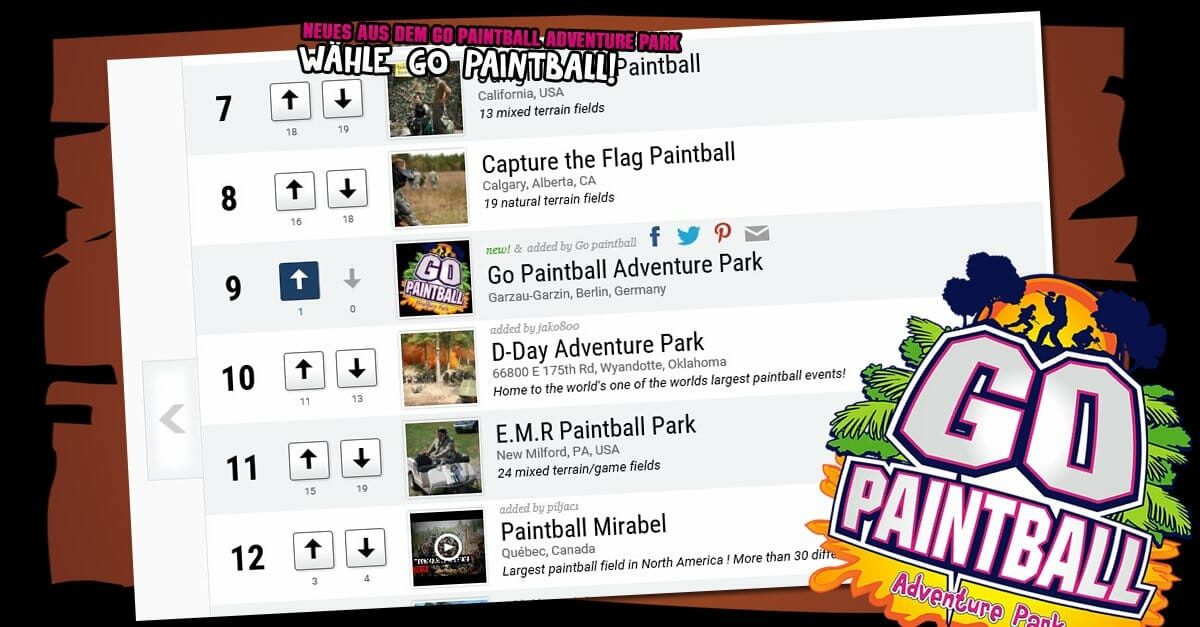wähle den GO PAINTBALL ADVENTURE PARK zu deinem liebsten Paintball Spielfeld. Besuche die Seite von Ranker.com (The World’s Best Paintball Fields) und gebe deine Stimme für GO PAINTBALL ab. Wir bedanken uns für eure Unterstützung und eure Teilnahme. Wir sehen uns im Park!