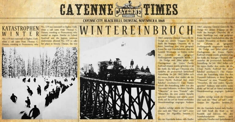 Cayenne Times 08. November 1868. Wintereinbruch Mit ihren Frauen und Kindern, die zu Besuch gekommen sind, paradieren die Bautrupps der Union Pacific stolz