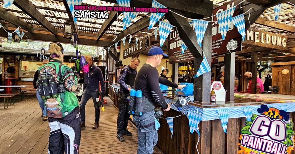 Oktober Wiesn ist angesagt und damit wartete wieder jede Menge Paintball Action und Spaß im GO PAINTBALL ADVENTURE PARK auf euch. Blau und weiß geschmückt startet der Park mit BYO, GO ARMY Special, bayrischen Spezialitäten und jede Menge geführten Spiele durch den Tag. Das Wetter erfreute uns mit ein wenig Regen vor der Öffnung des Parks und dann sogar Sonne. Ausgelassene Stimmung sorgte den ganzen Tag hinweg für ein tolles buntes Erlebnis. Natürlich haben wir für euch auch wieder viele schöne Bilder aufgenommen.