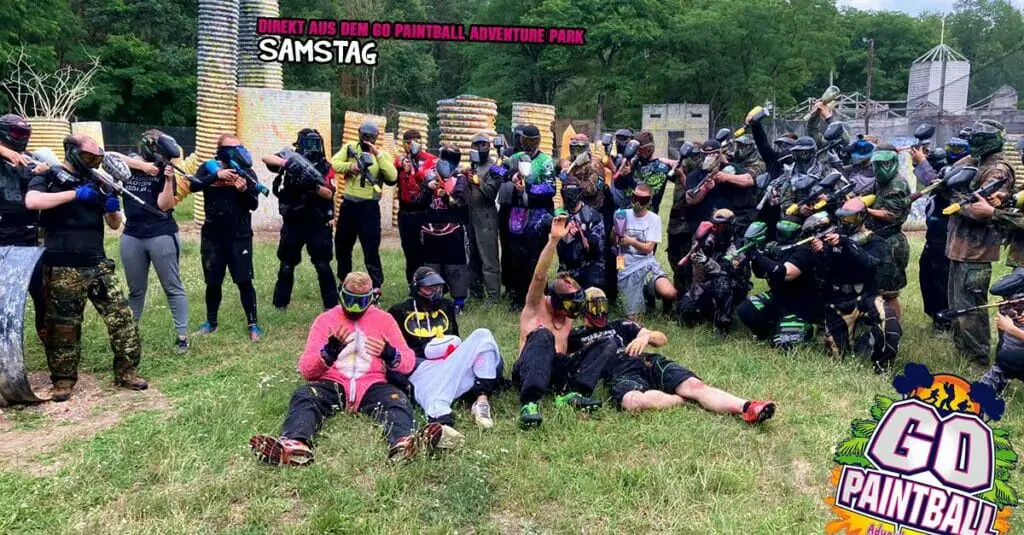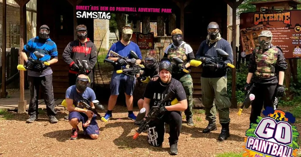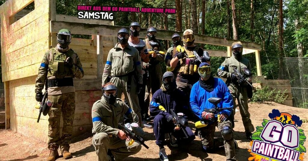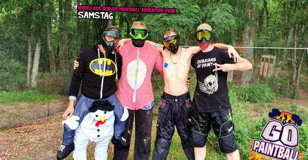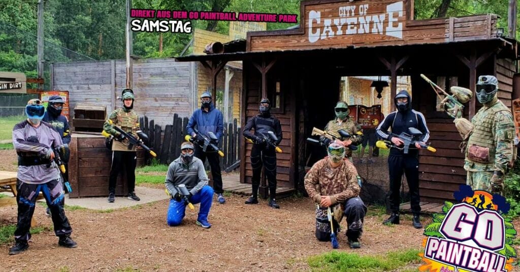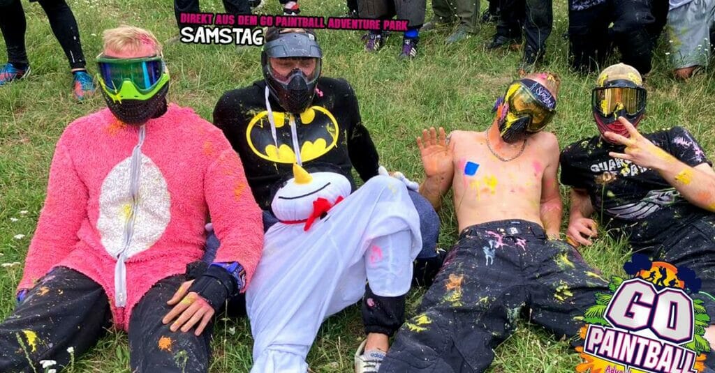 herzlich willkommen im Go Paintball Adventure Park. Wir weisen darauf hin, dass bei uns Farbe fliegen kann und wer nicht in Deckung geht, bekommt diese eben ab. Wir haben unter den Gästen ein paar gefunden, die sich vermutlich nicht richtig versteckt haben.