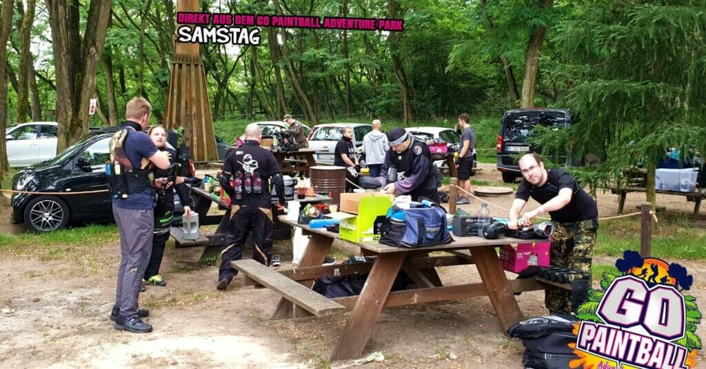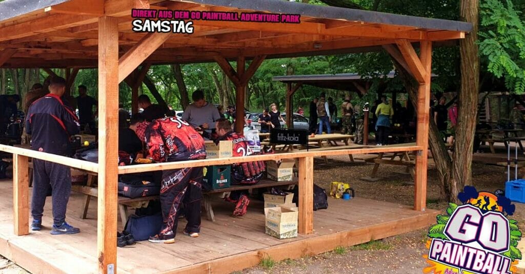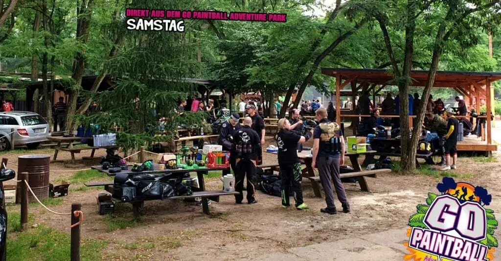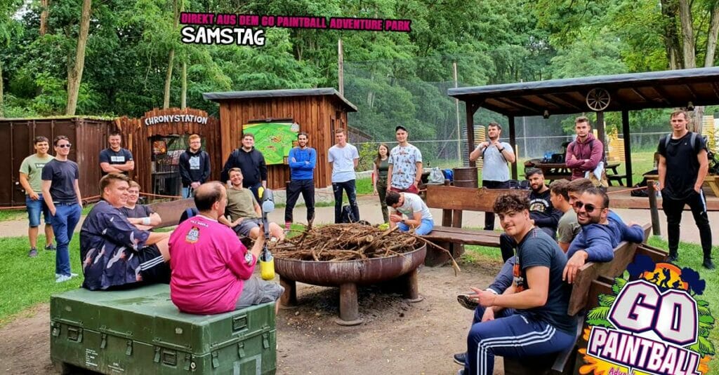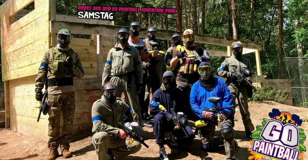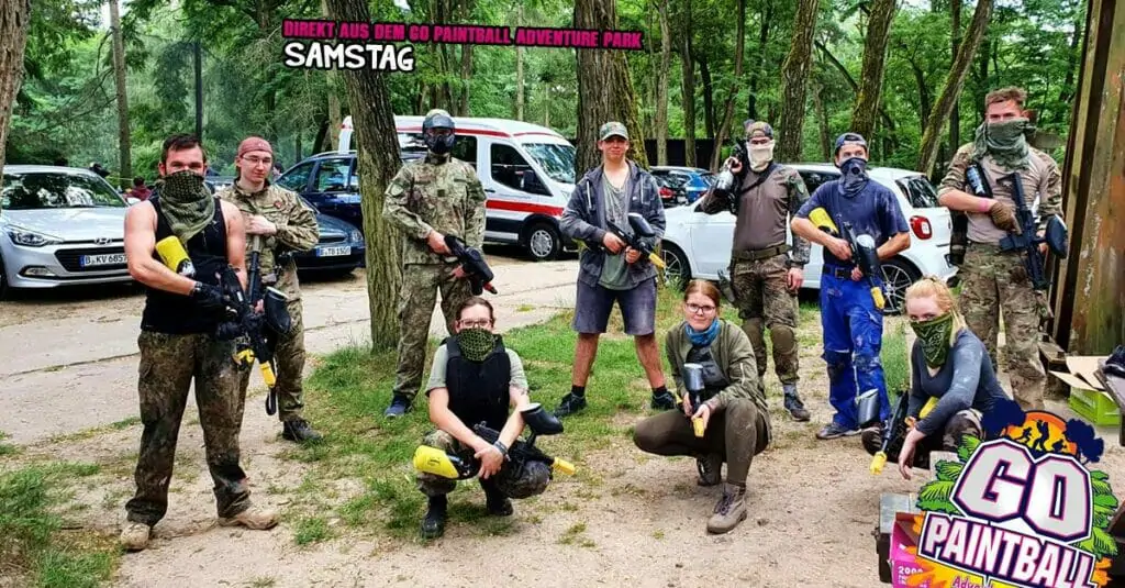 herzlich willkommen im Go Paintball Adventure Park. Wir weisen darauf hin, dass bei uns Farbe fliegen kann und wer nicht in Deckung geht, bekommt diese eben ab. Wir haben unter den Gästen ein paar gefunden, die sich vermutlich nicht richtig versteckt haben.