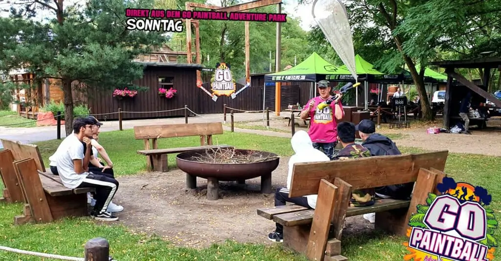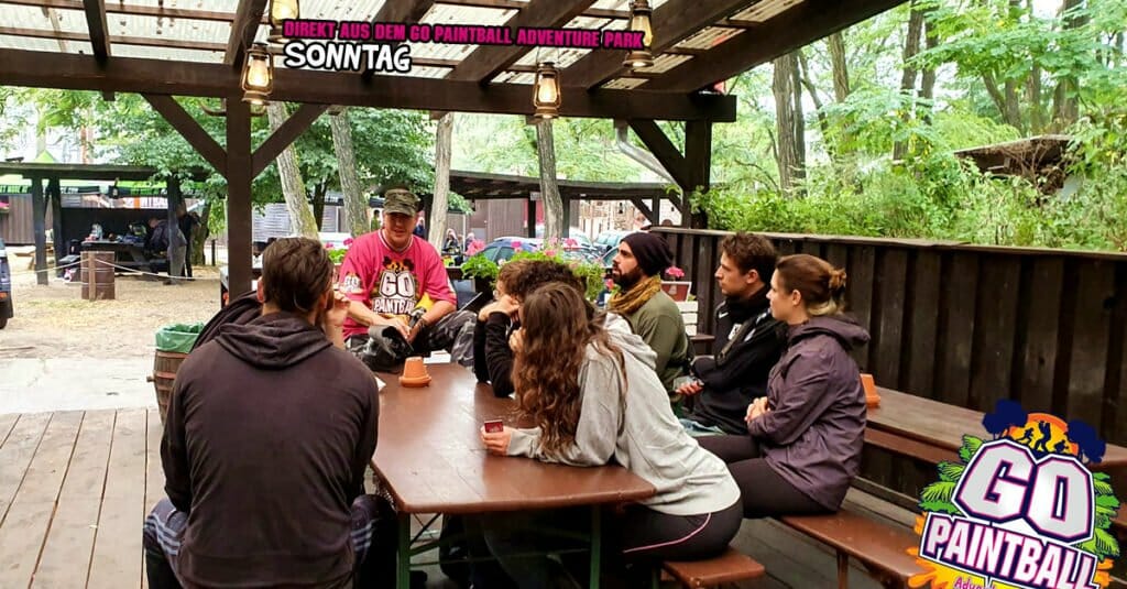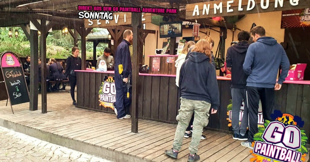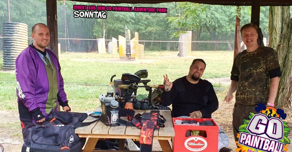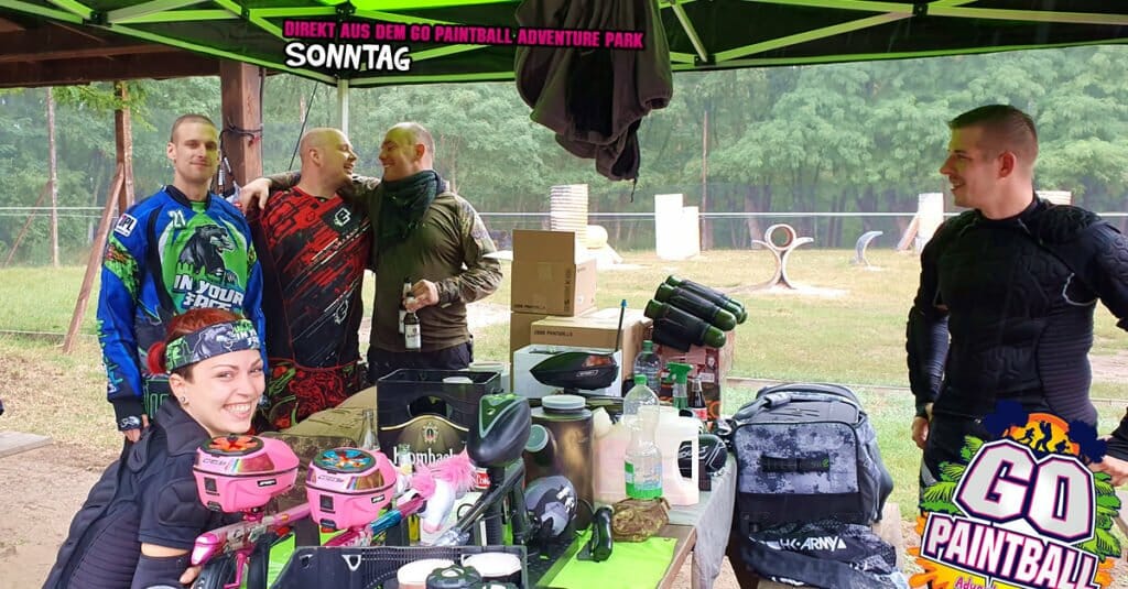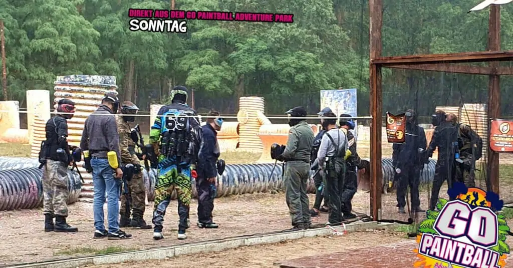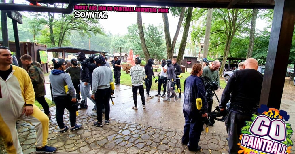 es regnet bis 11:30Uhr, bis 12:30Uhr, ach egal! Doch dann war der Regen plötzlich zu Ende. Eigentlich hat der Regen nicht wirklich gestört, laut der Gäste. Man sagt auch: „Paintball-Wetter“. In diesem Zusammenhang, wir haben auch Thermal-Masken im Verleih. Thermal-Masken halten bei feuchtem Wetter etwas länger durch und sorgen etwas länger für klare Sicht.