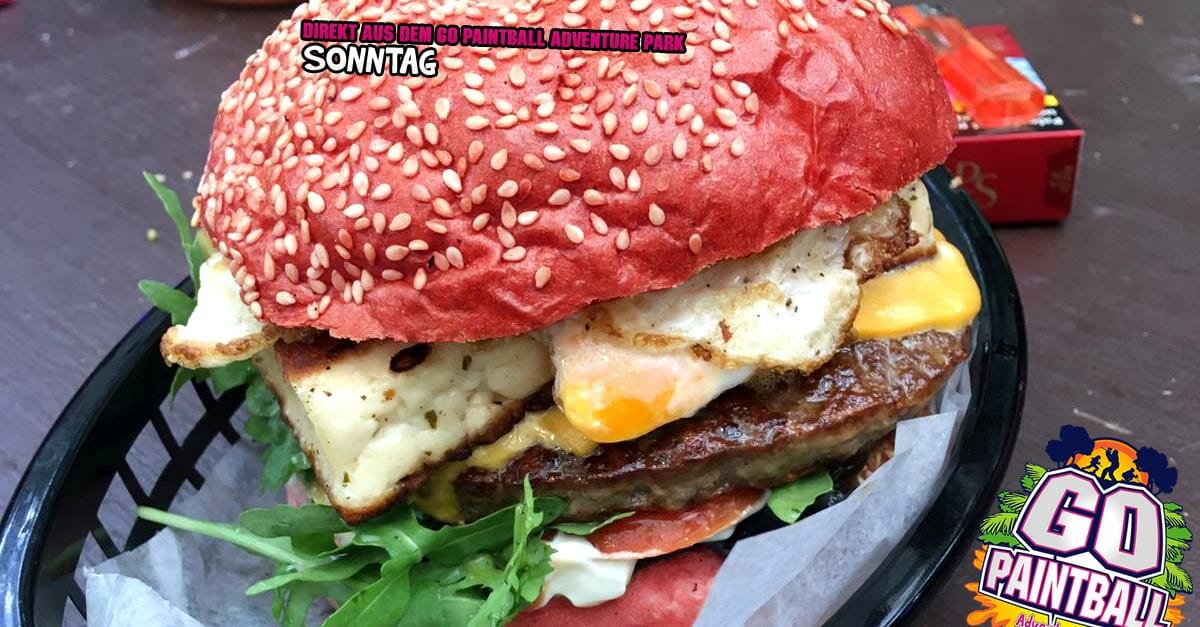 Aber kommen wir mal zu dem fetten Burger. Hier seht ihr den GO-Burger für den Platzwart, kurz PLAWA. Der Plawa ist am Tag der Wachhabende, der Chef, der König über den Park, Herr über die Markiererkammer und etwa 10 Millionen Paintballs. Als König, Kaiser oder gottähnliches Wesen gibt es für Ihn den PLAWA-Burger, wenn der Küchenchef Lust darauf hat. Der Plawa und der Küchenchef sollten also beste Freunde sein. Ihr seht selber, was da dann so alles für den Eiweiß-Schock darauf ist. Nach dem Burger-Massaker geht der Plawa bis die Schicht vorbei ist wieder schlafen und das fleißige Team bereitet alles für den Feierabend vor.