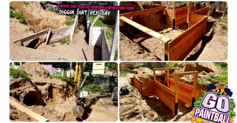 Hallo liebe Gäste, liebe Freunde und Unterstützer des GO PAINTBALL ADVENTURE PARKS, wie angekündigt wurde heute Diggin Dirt begonnen zu reparieren. Das Grabenfeld ist bereits