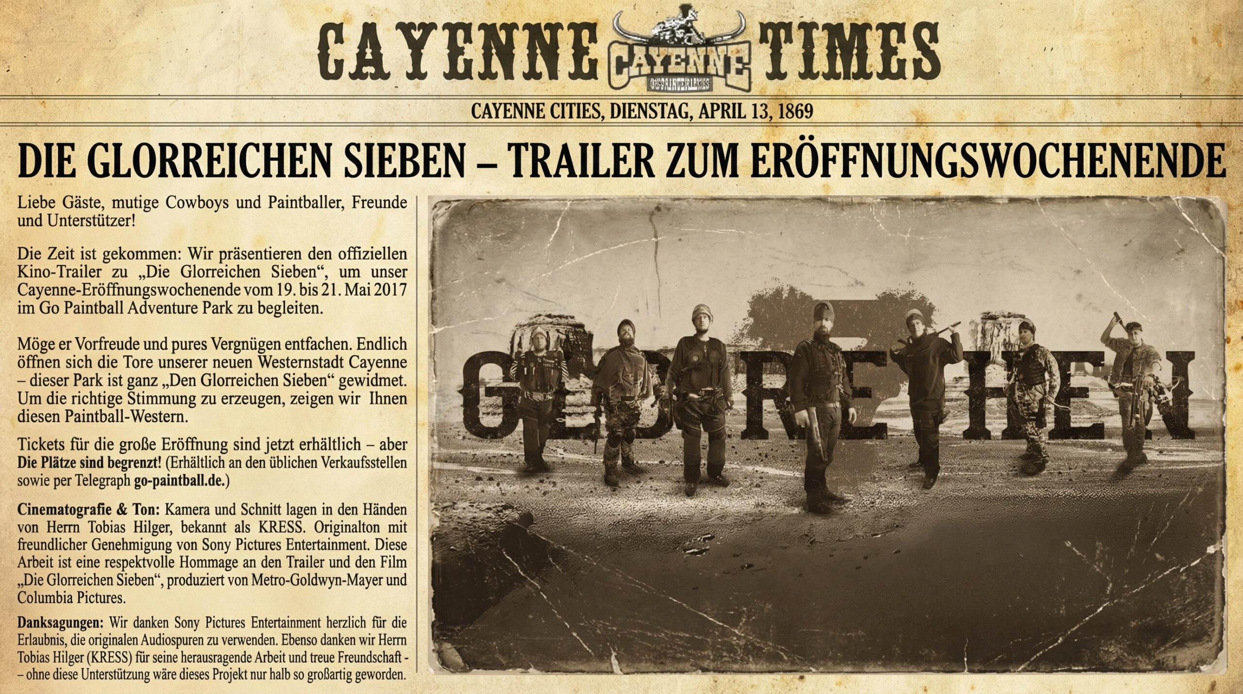Eröffnungswochenende in Cayenne: Sehet den Trailer „Die Glorreichen Sieben“. Vom 19.–21. Mai 2017 öffnet die Westernstadt ihre Pforten – Karten begrenzt!