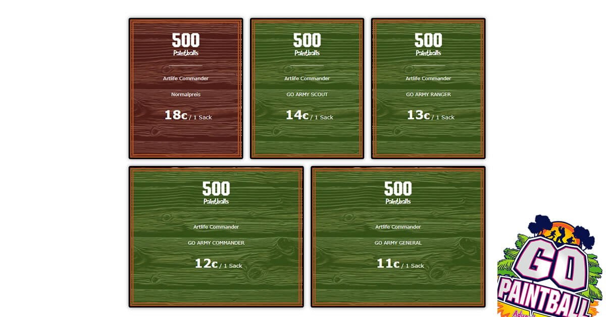 Ebenfalls gibt es eine GO ARMY Preisstaffel für die normalen Paintballs. Möglicherweise wird es neben den GO PAINTBALLS noch eine alternative Sorte Paintballs geben. Wir würden uns daher freuen, wenn ihr hierzu Vorschläge macht und Erfahren mit uns teilen könnt. Das was und wie ist noch nicht ganz klar.